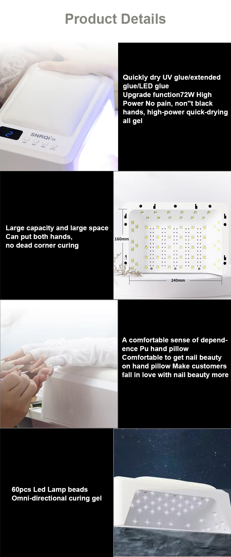 Ngwaahịa ahụ na-eme ka o doo anya ọbụna ihicha gluu na-enweghị shrinkage. Isi mmalite ọkụ ya abụọ na-enye ọkụ dị nro iji gbochie ngbanwe aka na nhụhụ anya, dabara adaba maka aka na ụkwụ abụọ, na-ebute nsonaazụ ihicha ngwa ngwa.